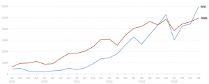Doanh số bán xe hàng quý của BYD và Tesla – Nguồn: CNN.