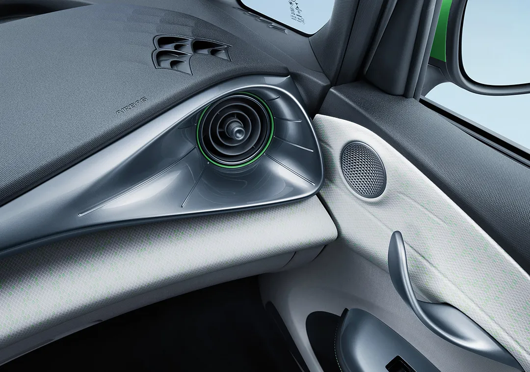Không gian nội thất tiếp nối dòng chảy thiết kế. Điểm nhấn là bảng điều khiển trung tâm dạng treo, một kiến trúc tương lai tạo cảm giác hiện đại và rộng mở. Các chi tiết kim loại được chế tác tinh xảo thành một bề mặt cong tối giản.