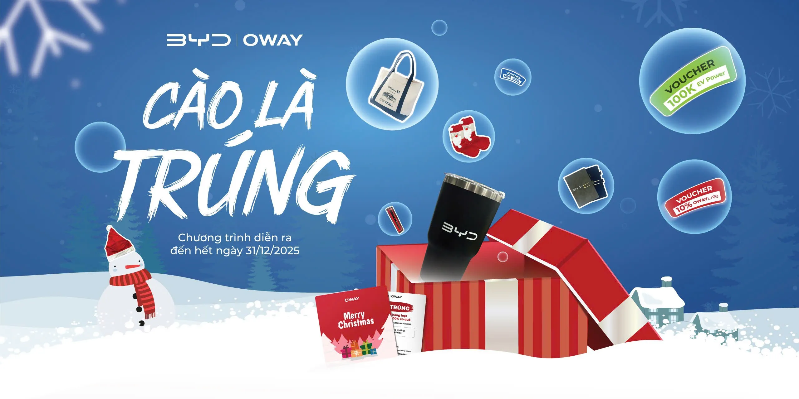 Ly giữ nhiệt, nón Noel, túi tote, sổ tay, bút viết, voucher giảm 10% – 50% dịch vụ OWAY LAB, voucher sạc EV Power,…